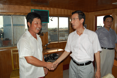 張書(shū)記(左二)與第七工程處皖吸五號(hào)船長(zhǎng)親切交談