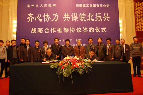 2011年12月27日,由我公司和亳州城市建設(shè)投資有限責(zé)任公司共同承辦的亳州市政府與安徽建工戰(zhàn)略合作框架協(xié)議簽約儀式,在合肥稻香樓賓館隆重舉行。亳州市委書記、市人大常委會主任方春明,市委副書記、市長沈強(qiáng),集團(tuán)公司董事長、黨委書記胡運(yùn)成,總經(jīng)理、副董事長、黨委副書記趙時運(yùn)出席簽約儀式。同時出席簽約儀式的還有亳州市委常委、政法委書記楊長俊,亳州市委常委、市宣傳部長杜愛玉,市政府秘書長侯化,市政府黨組成員、副秘書長鄒桂武,市委副秘書長、辦公室主任靳家海,市住房城鄉(xiāng)建設(shè)委主任孔祥永,市委宣傳部副部長穆靜;集團(tuán)公司董事、安徽水利開發(fā)股份有限公司總經(jīng)理楊廣亮,副總經(jīng)理劉家靜,副總經(jīng)理霍向東,副總經(jīng)理王元曦,企業(yè)發(fā)展部主任趙作平,亳州城市建設(shè)投資有限責(zé)任公司總經(jīng)理韋翔,亳州市財政局農(nóng)村綜合改革開放辦公室主任陳淑敏,集團(tuán)公司董事會秘書處主任徐文聯(lián),亳州城市建設(shè)投資有限責(zé)任公司副總經(jīng)理李濤以及我公司全體領(lǐng)導(dǎo)班子成員。此次簽約儀式還受到了安徽電視臺、安徽日報社、合肥電視臺、新安皖報社、亳州市電視臺、亳州日報等諸多新聞媒體的高度關(guān)注并予報道。