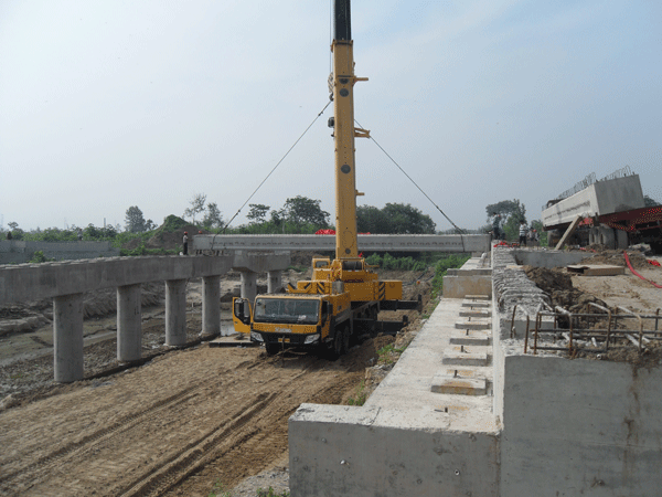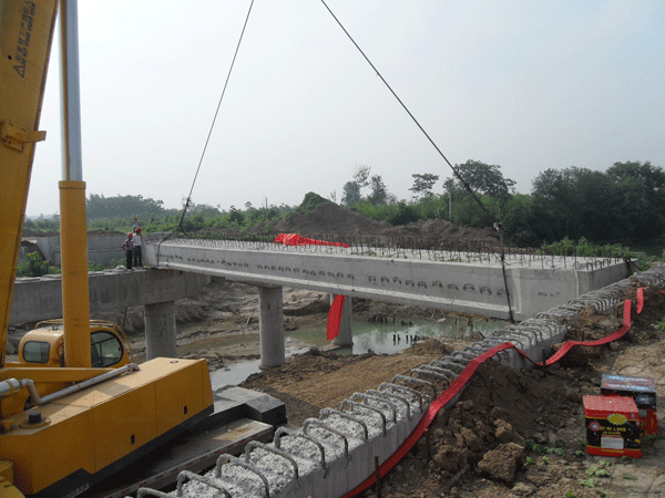 2012年7月22日9時16分,隨著施工現(xiàn)場鞭炮、禮花齊鳴,亳州市南擴(kuò)二路漳河橋安裝正式開始。亳州市重點(diǎn)局副局長郭來運(yùn)、第四項(xiàng)目辦主任修功華、技術(shù)組組長包厚禮、南擴(kuò)二路項(xiàng)目部全體成員參加梁板安裝儀式。