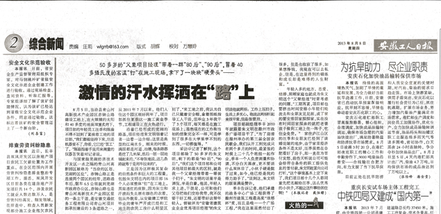 編者按:安徽工人日?qǐng)?bào)8月8日2版頭條報(bào)道了我公司青山河項(xiàng)目部項(xiàng)目經(jīng)理朱文明的先進(jìn)事跡。