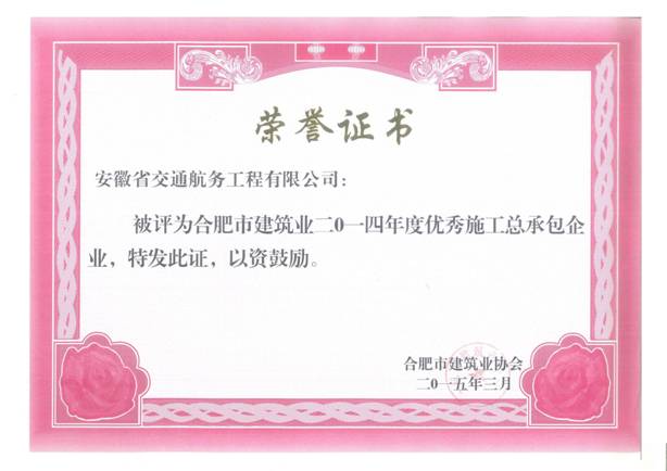 近日,合肥市建筑業(yè)協(xié)會公布了2014年度合肥市建筑業(yè)企業(yè)表彰名單,我公司榜上有名,喜獲“合肥市建筑業(yè)企業(yè)50強”、“合肥市優(yōu)秀施工總承包企業(yè)”兩項榮譽稱號。