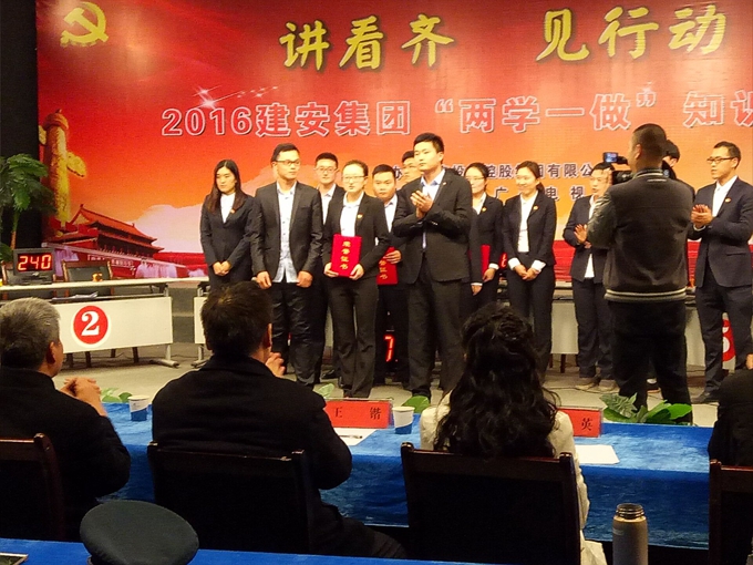 12月2日,建安集團“講看齊,見行動”兩學一做知識競賽決賽在亳州電視臺舉行,建工黨支部代表隊力挫群雄,最終獲得二等獎。