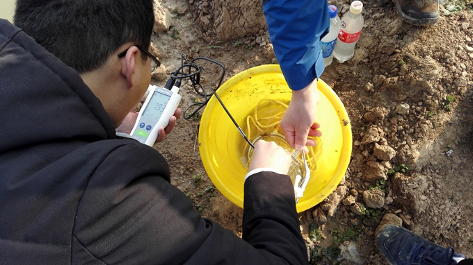 課題組一行在聽取項目概況和有關(guān)介紹后,實地察看了中湖地質(zhì)環(huán)境治理項目(一期、二期)總體控制性詳細(xì)規(guī)劃區(qū)域。根據(jù)察看結(jié)果和背景資料,分析了該科研項目當(dāng)前緊迫的任務(wù)、現(xiàn)場地形地貌和周邊環(huán)境(特別是水系和塌陷區(qū)采空層情況),具體采樣工作包括采集土樣、水樣、沉降觀測點(diǎn)的選擇,并實時檢測了水樣的pH值等基礎(chǔ)指標(biāo)等。