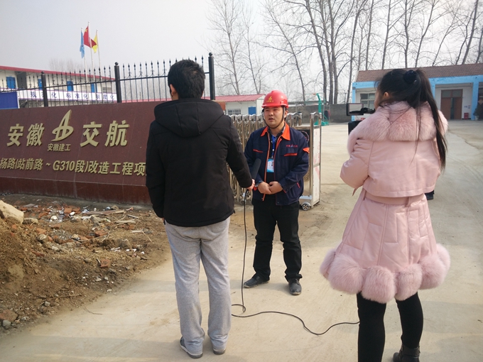 1月11日上午,蕭縣電視臺采訪小組到安徽交航蕭縣蕭楊路(站前路-G310段)工程項目經理部施工現場進行新聞采訪,就該項目工地標準化建設,施工進展、工程重難點等進行拍攝、采訪。項目經理徐鑫接受記者采訪,并詳細介紹該項目工程概況和目前施工情況。
