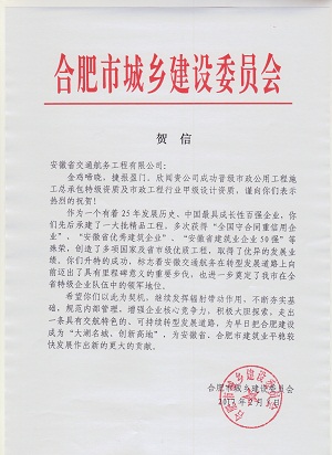 近日,合肥市建委向安徽交航發(fā)來(lái)賀信,熱烈祝賀安徽交航市政公用工程施工總承包特級(jí)資質(zhì)及市政行業(yè)甲級(jí)設(shè)計(jì)資質(zhì)。