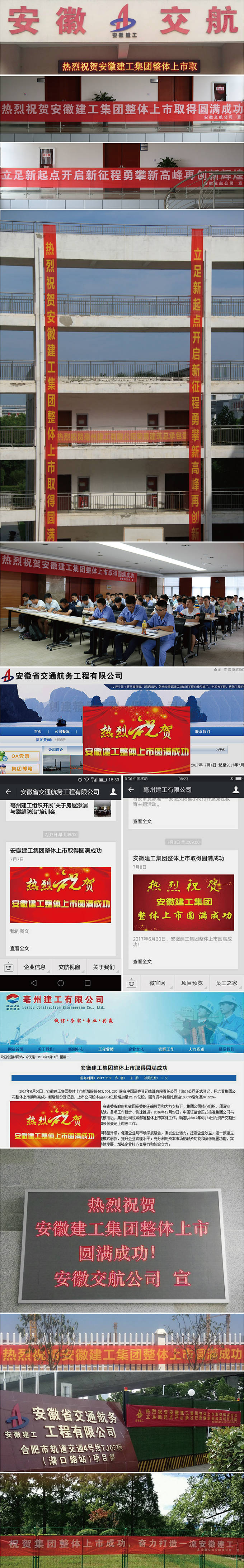 【編者按】2017年6月30日,安徽建工集團(tuán)整體上市新增股份463,554,265股在中國證券登記結(jié)算有限責(zé)任公司上海分公司正式登記,標(biāo)志著集團(tuán)公司整體上市取得圓滿成功!安徽交航公司黨委根據(jù)集團(tuán)黨委《關(guān)于做好慶祝集團(tuán)公司整體上市成功宣傳工作的通知》精神,積極響應(yīng)、縝密謀劃,全員參與、多策并施,全方位多角度立體化深層次宣傳集團(tuán)公司整體上市成功,成效斐然……