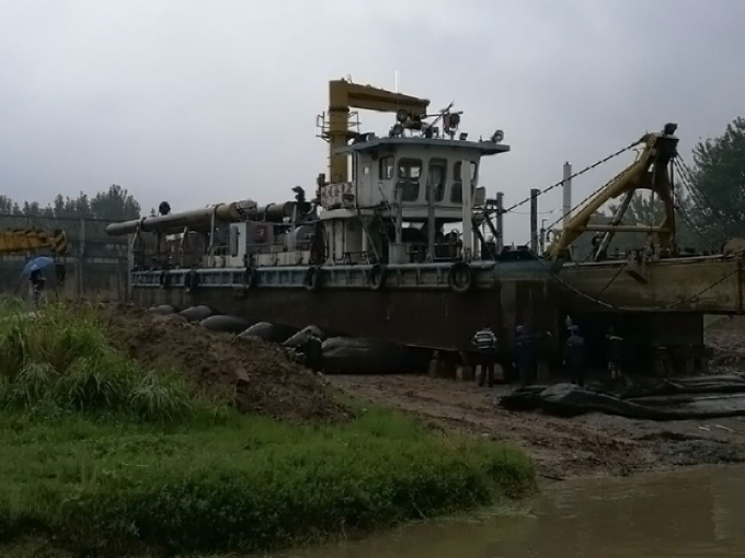 在此期間,我公司“皖吸十一號(hào)”等九艘船舶已在鳳臺(tái)鑫舶瀚船廠進(jìn)行修理。由于該船廠沒(méi)有承接大噸位挖泥船上坡的經(jīng)驗(yàn),在淮河水位較低的情況下他們提出的幾個(gè)方案無(wú)法落實(shí),而淮河流域附近又沒(méi)有更合適的船廠可以完成上坡工作。商經(jīng)理憑著數(shù)十年的工作經(jīng)驗(yàn),積極聯(lián)系有資質(zhì)、有經(jīng)驗(yàn)的外協(xié)人員參與作業(yè)。8月12日商經(jīng)理利用周末休息時(shí)間再次冒雨親赴現(xiàn)場(chǎng)指揮,終于使“皖吸11號(hào)”順利安全上坡并加以固定。