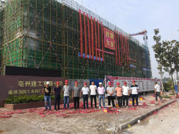 2017年9月21日9點(diǎn)18分,伴隨著震耳欲聾的鞭炮和歡呼聲,亳州建工渦陽工業(yè)園區(qū)廠房及綜合樓工程A9#倉庫順利封頂。業(yè)主單位、監(jiān)理單位主要負(fù)責(zé)人及項(xiàng)目部全體成員參加了此次封頂儀式。
