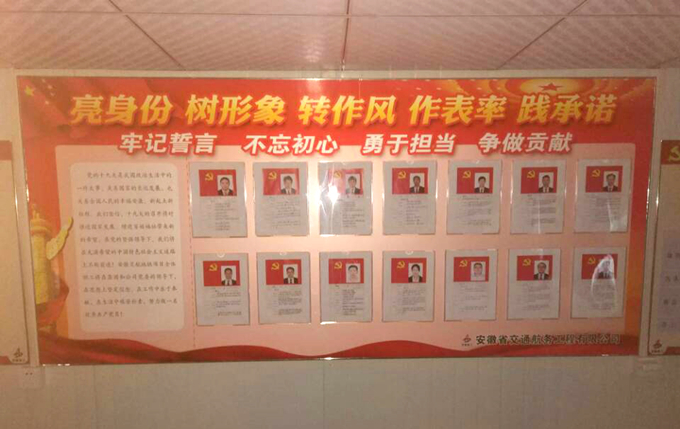 黨員活動(dòng)室中懸掛黨員身份、鄭重承諾展板,旨在增強(qiáng)黨員的宗旨意識(shí)、服務(wù)意識(shí)、責(zé)任意識(shí)和效率意識(shí),調(diào)動(dòng)黨員同志的主動(dòng)性、自覺(jué)性、創(chuàng)造性,有效發(fā)揮黨員的先鋒模范作用,促進(jìn)項(xiàng)目科學(xué)管理,增強(qiáng)表率作用的監(jiān)督和內(nèi)省。秉承“亮出你的身份、展示你的風(fēng)采”理念,使黨員同志成為排頭兵、中堅(jiān)力量,通過(guò)布置、落實(shí),全體黨員明確了:“亮身份”要樹(shù)立“我的第一身份是黨員”的角色意識(shí),真正做到平時(shí)看得出;“展風(fēng)采”要做到黨員風(fēng)采在項(xiàng)目,黨員風(fēng)采在工地;“比奉獻(xiàn)”要在施工生產(chǎn)工作中發(fā)揮黨員的示范作用,發(fā)揚(yáng)奉獻(xiàn)精神。