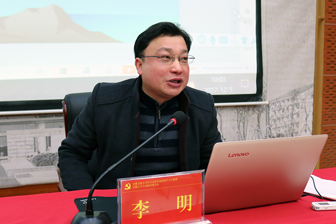 黨的十九大精神安徽“百人宣講團(tuán)”成員、安徽省學(xué)術(shù)和技術(shù)帶頭人后備人選、教育部“全國(guó)高校思想政治理論課教學(xué)能手”、安徽大學(xué)馬克思主義學(xué)院教授、博士生導(dǎo)師李明以《把握新時(shí)代 領(lǐng)會(huì)新思想 開啟新征程》為題,全方位、多角度、深層次解讀了黨的十九大報(bào)告。李教授從為什么能夠進(jìn)入新時(shí)代、進(jìn)入新時(shí)代的意義、新時(shí)代的內(nèi)涵、新時(shí)代的主要矛盾、新時(shí)代的使命等方面闡釋了“新時(shí)代”;從形成條件、主要內(nèi)容、基本方略、精神實(shí)質(zhì)等方面分析了“新思想”;從戰(zhàn)略安排方面剖析了“新征程”。