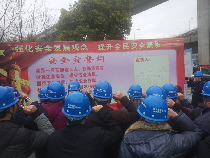 上午11:00時,在地鐵項目部安全體驗區(qū),30余名職工莊嚴地舉起右手,由項目安全總監(jiān)朱紅輝帶領進行宣誓,并鄭重地在安全質(zhì)量宣誓牌上逐一簽名,宣誓活動圓滿完成。