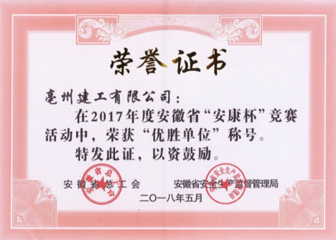 日前,亳州建工被安徽省總工會、安徽省安全生產(chǎn)監(jiān)督管理局評為2017年度安徽省“安康杯”競賽優(yōu)勝單位。