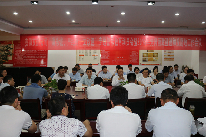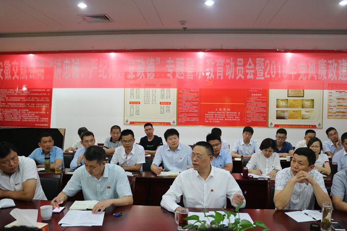 6月13日上午,安徽交航公司“講忠誠、嚴(yán)紀(jì)律、立政德”專題警示教育動員暨2018年黨風(fēng)廉政建設(shè)和反腐敗工作會議在公司九樓會議室召開。公司黨委書記、董事長、總經(jīng)理李世龍全文傳達(dá)了集團(tuán)公司黨委書記、董事長趙時運(yùn)在集團(tuán)公司“講忠誠、嚴(yán)紀(jì)律、立政德”專題警示教育動員暨2018年黨風(fēng)廉政建設(shè)和反腐敗工作會議上的講話,并就交航公司專題警示教育作動員講話,就公司黨風(fēng)廉政建設(shè)和反腐敗工作提出具體要求;公司黨委副書記、副總經(jīng)理方申柱傳達(dá)了有關(guān)案件警示材料;公司黨委委員、紀(jì)委書記、工會主席李楊全文傳達(dá)了集團(tuán)公司黨委委員、紀(jì)委書記宋志華在集團(tuán)專題警示教育動員暨2018年黨風(fēng)廉政建設(shè)和反腐敗工作會上的講話,并作相關(guān)工作安排。