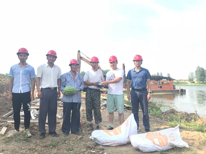 沱澮河項(xiàng)目部領(lǐng)導(dǎo)班子成員前往各施工班組,給正在烈日下作業(yè)的一線工人送去西瓜、仁丹、藿香正氣水等防暑降溫用品,以表示對各個(gè)崗位上的一線工人在高溫環(huán)境工作的關(guān)懷。并向他們強(qiáng)調(diào),一定要注意防暑降溫,保護(hù)好身體,合理排班,杜絕中暑情況發(fā)生。