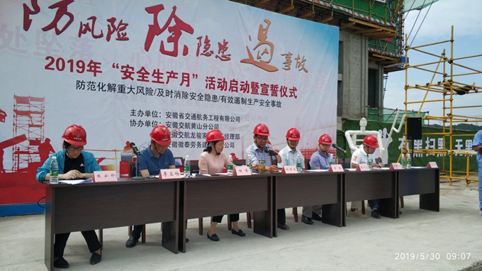 今年6月是全國(guó)第18個(gè)“安全生產(chǎn)月”,按照安徽建工集團(tuán)公司統(tǒng)一部署,在全公司范圍內(nèi)開(kāi)展“安全生產(chǎn)月”活動(dòng)。安徽交航“安全生產(chǎn)月”活動(dòng)啟動(dòng)儀式暨宣誓儀式在黃山龍駿家園項(xiàng)目施工現(xiàn)場(chǎng)順利舉行,由交航公司副總經(jīng)理、總工程師劉朝發(fā)、紀(jì)委書記、工會(huì)主席李楊、財(cái)務(wù)總監(jiān)程慧、工管部主任、生產(chǎn)總調(diào)度周和友、安全監(jiān)察部主任朱云珍、黃山項(xiàng)目負(fù)責(zé)人李陽(yáng)及安全監(jiān)察部所屬各項(xiàng)目安全員出席參加。