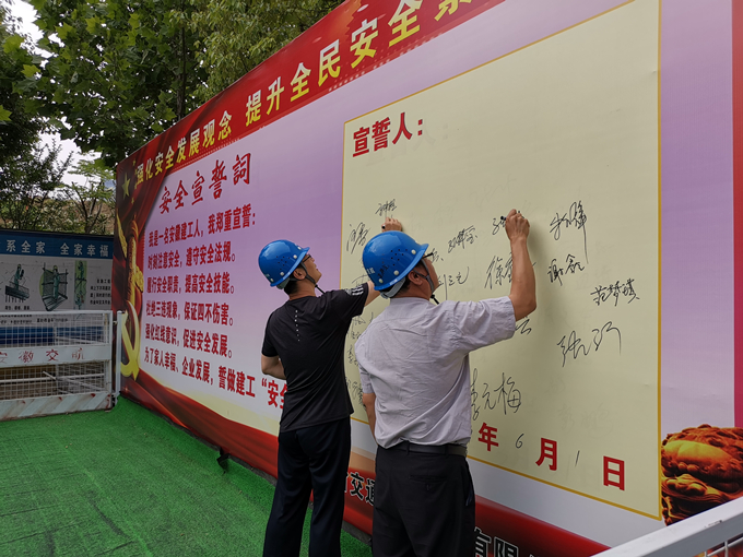 6月1日下午16:00公司總經(jīng)理、黨委副書記方申柱,副總經(jīng)理、總工程師劉朝發(fā)赴項目檢查指導(dǎo)安全生產(chǎn)月的活動開展情況,并在安全宣誓詞及安全生產(chǎn)月活動主題標(biāo)語上簽名,重點強調(diào)了安全生產(chǎn)月重要意義,提出了著重宣傳安全生產(chǎn)的重大意義和法律法規(guī)規(guī)定、推進(jìn)企業(yè)安全生產(chǎn)主體責(zé)任的落實等工作要求,全面安排部署了安全生產(chǎn)月活動。