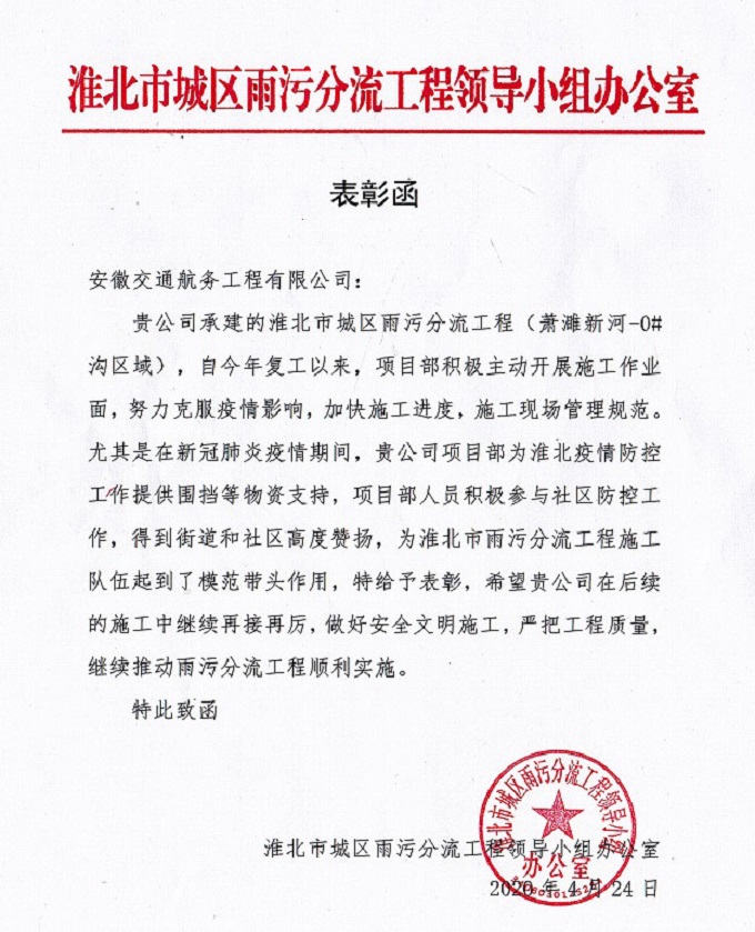 表彰函雖只是薄薄的一頁紙,但卻是業(yè)主對我們工作和付出的肯定。淮北市雨污分流項目部在接下來的工作中必將再接再厲,更上一個臺階,切實履行國有企業(yè)社會責任,不負兩級領導的期望和業(yè)主的重托。