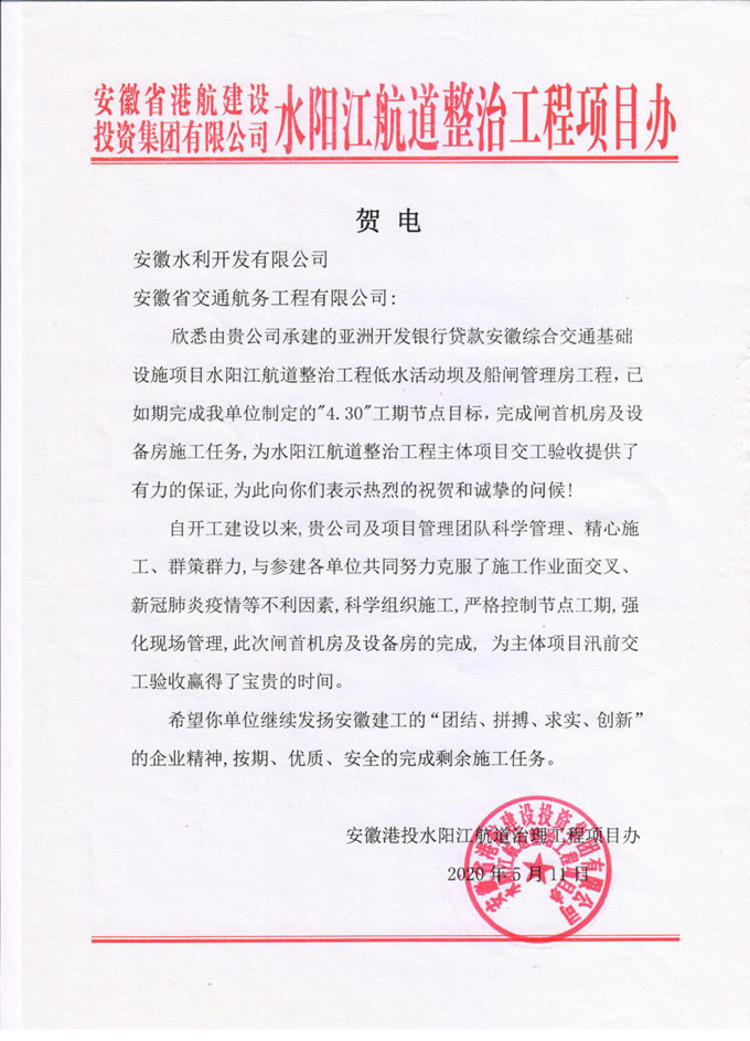 《賀電》指出,自開工建設(shè)以來,安徽交航及項目管理團隊科學管理、精心施工、群策群力,與參建各單位共同努力克服了施工作業(yè)面交叉、新冠肺炎疫情等不利因素,科學組織施工,嚴格控制節(jié)點工期,強化現(xiàn)場管理,此次閘首機房及設(shè)備房的完成,為主體項目汛前交工驗收贏得了寶貴時間。同時,希望安徽交航水陽江項目部繼續(xù)發(fā)揚“團結(jié)、拼搏、求實、創(chuàng)新”的企業(yè)精神,按期、按質(zhì)、安全的完成剩余施工任務(wù)。