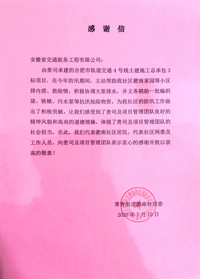7月28日早上,安徽交航合軌4號(hào)線TJ03標(biāo)項(xiàng)目部收到一封來自駐地社居委送來的感謝信,對(duì)項(xiàng)目部主動(dòng)幫助社區(qū)排內(nèi)澇、救險(xiǎn)情以及義務(wù)捐助防汛物資的志愿服務(wù)行動(dòng)給予了高度贊揚(yáng),并表達(dá)了由衷感謝。