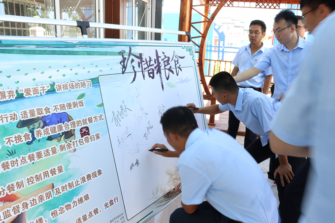 活動現(xiàn)場,10余名項目部黨員干部舉起右手莊重承諾:“理性消費,摒棄愛面子講排場的陋習;加入光盤行動,適量取食,不隨便剩飯;不偏食、不挑食,養(yǎng)成健康合理的就餐方式;餐館用餐時點餐要適量,剩余打包帶回家;推行分餐制,控制用餐量;積極監(jiān)督身邊親朋 及時制止浪費現(xiàn)象?!蓖瑫r,全體黨員干部紛紛表示,一粥一飯,當思來之不易,拒絕浪費、厲行節(jié)約,應(yīng)從我們每個人做起,適量點餐、光盤行動,應(yīng)從我們每個人做起。