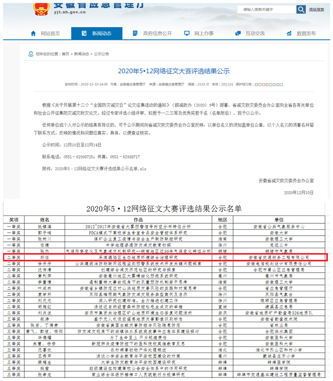 近日,從安徽省應(yīng)急管理廳網(wǎng)站獲悉,全省防災(zāi)減災(zāi)救災(zāi)論文評選結(jié)果正式揭曉,安徽交航公司報送的《采煤塌陷區(qū)生態(tài)地質(zhì)環(huán)境綜合治理研究》論文喜獲二等獎。