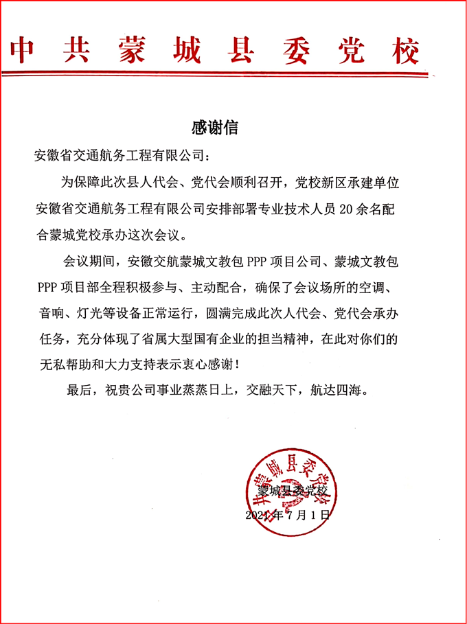 會(huì)議期間,蒙城文教包PPP項(xiàng)目公司、蒙城文教包PPP項(xiàng)目部安排20余名專業(yè)技術(shù)人員全程積極參與、主動(dòng)配合,周密部署、精心安排,以“嚴(yán)之又嚴(yán)、細(xì)之又細(xì)、實(shí)之又實(shí)、全之又全”的態(tài)度,派駐專業(yè)技術(shù)人員24小時(shí)對(duì)會(huì)場(chǎng)的空調(diào)、音響、燈光等設(shè)備進(jìn)行維護(hù)調(diào)試,保障了會(huì)議期間會(huì)場(chǎng)設(shè)備安全運(yùn)行,圓滿完成了此次人代會(huì)和黨代會(huì)承辦任務(wù)。為此,蒙城縣委黨校發(fā)來(lái)感謝信,對(duì)蒙城項(xiàng)目公司的全力配合和無(wú)私幫助表示感謝,并祝安徽交航事業(yè)蒸蒸日上。