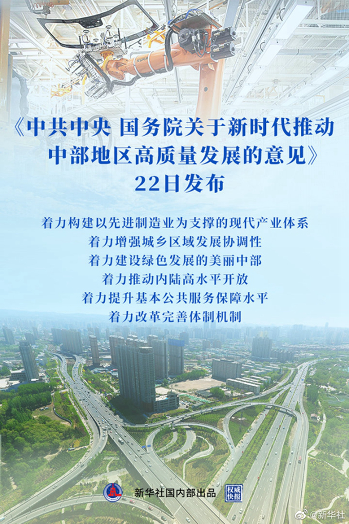 《中共中央 國務院關于新時代推動中部地區(qū)高質量發(fā)展的意見》22日發(fā)布,順應新時代新要求,為推動中部地區(qū)高質量發(fā)展勾勒藍圖。