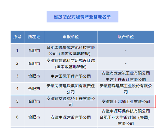 日前,安徽交航公司與安徽建工北城工業(yè)公司組成聯(lián)合體成功入選省級(jí)裝配式建筑產(chǎn)業(yè)基地,成為安徽首家以市政為主業(yè)的裝配式建筑產(chǎn)業(yè)基地。