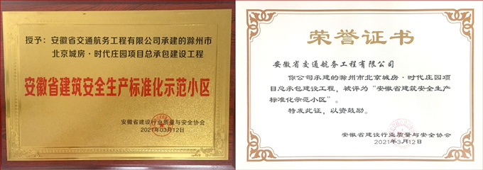 近日,從安徽省建筑行業(yè)質(zhì)量與安全協(xié)會(huì)傳來喜訊,安徽交航公司承建的滁州時(shí)代莊園項(xiàng)目榮獲“安徽省建筑安全生產(chǎn)標(biāo)準(zhǔn)化示范小區(qū)”榮譽(yù)稱號(hào)。