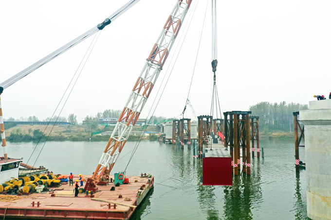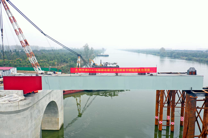 10月28日下午4點10分,隨著一節(jié)重達53噸的鋼箱梁穩(wěn)穩(wěn)地架設到馬胡橋4#主墩支座位置上,利辛S247馬胡橋項目首節(jié)鋼箱梁架設宣告成功,標志著馬胡橋進入鋼箱梁“拼積木”階段,主橋上部結構施工將進入“快車道”。