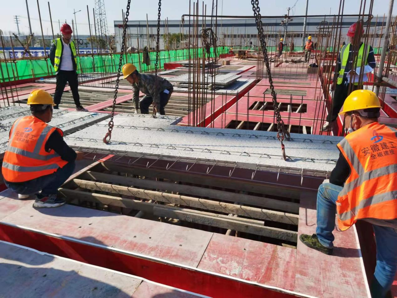 11月15日上午,全椒縣大墅產(chǎn)業(yè)新城電商物流園裝配式EPC項目10#樓首層裝配式疊合樓板順利吊裝。