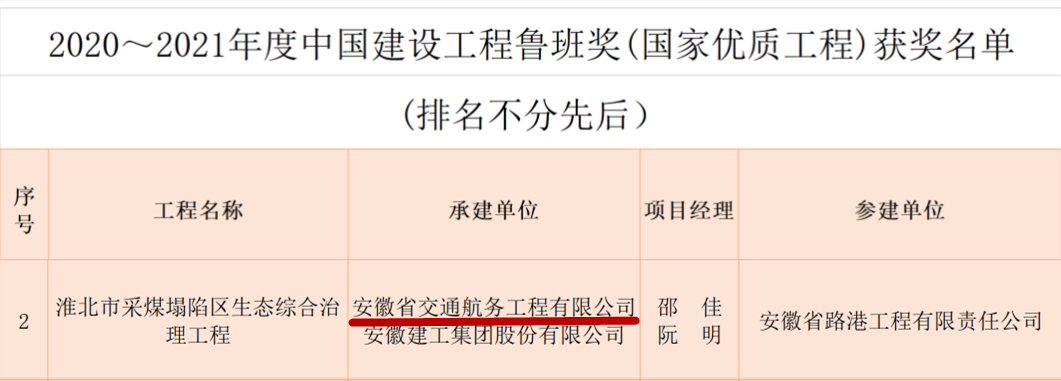 近日,中國建筑業(yè)協(xié)會公布了2020~2021年度中國建設(shè)工程魯班獎(國家優(yōu)質(zhì)工程)名單,安徽交航承建的淮北市采煤塌陷區(qū)生態(tài)綜合治理工程榮登榜單,獲評中國建設(shè)工程最高獎項(xiàng)——魯班獎。