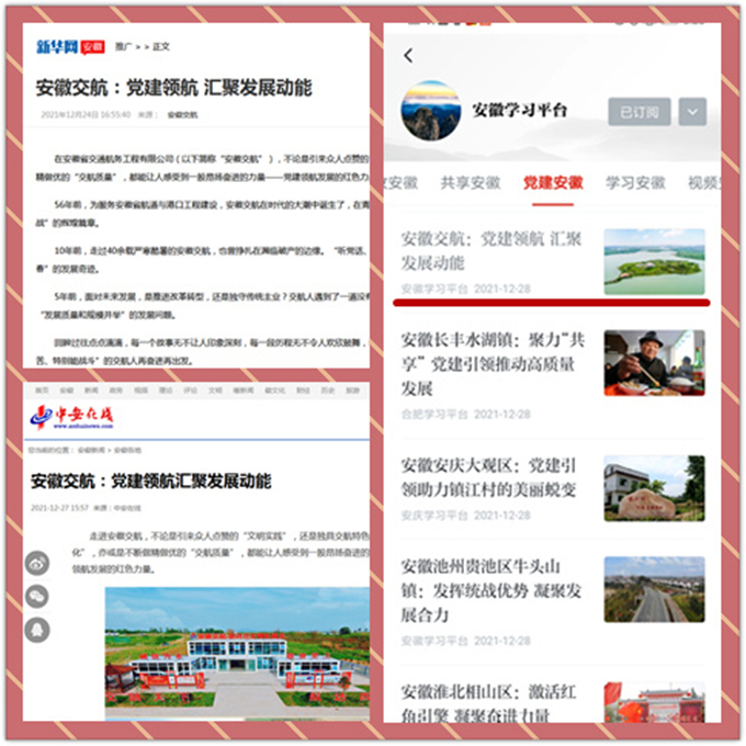 近日,新華社(新華網)、學習強國、中安在線等中央及省級主流媒體,紛紛聚焦安徽交航黨建工作,集中報道了十九大以來安徽交航深入學習貫徹習近平新時代中國特色社會主義思想,堅持和加強黨的領導,推進全面從嚴治黨及以黨建領航高質量發(fā)展等方面取得的一系列成果。