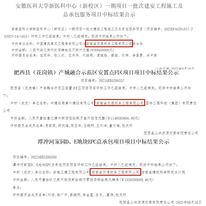8月11日,是一個安徽交航公司的“大日子”,一天拿下兩個大項目近27億元訂單。安徽交航與中國建筑第五工程局有限公司聯(lián)合體中標(biāo)安徽醫(yī)科大學(xué)新醫(yī)科中心(新校區(qū))一期項目一批次建安工程施工及總承包服務(wù),中標(biāo)價789458000.00元。該項目位于項目安徽醫(yī)科大學(xué)新醫(yī)科中心(新校區(qū))東北側(cè),總建筑面積約202500㎡。安徽交航與安徽三建工程有限公司、安徽省建筑科學(xué)研究設(shè)計院聯(lián)合體中標(biāo)潭沖河家園D、E地塊EPC總承包項目,中標(biāo)價1926280688.40元。該項目建設(shè)內(nèi)容包括39棟安置房,一所十八班幼兒園商業(yè)、農(nóng)家超市及其他配套,總建筑面積55.37萬㎡。