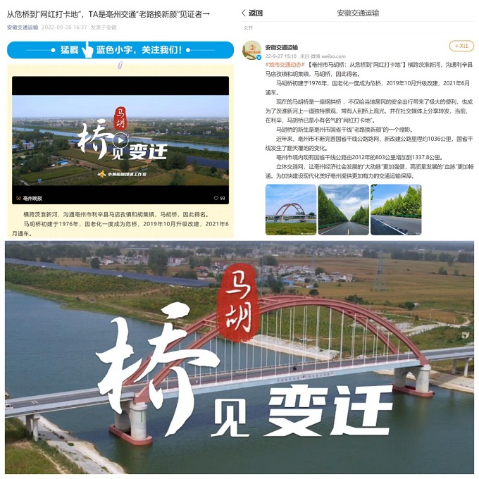 近日,安徽交通運(yùn)輸廳微博和公眾號分別轉(zhuǎn)發(fā)亳州晚報(bào)對安徽交航公司改建利辛縣馬胡橋?qū)n}報(bào)道。馬胡橋改建工程于2019年10月18日開工建設(shè),2021年6月8日完成交工驗(yàn)收。在安徽交航公司的雕琢之下,馬胡橋從一座年久失修、無人問津的危橋華麗轉(zhuǎn)身當(dāng)?shù)亍熬W(wǎng)紅打卡地”,老橋換新顏,不僅成為居民出行的高效通道,也成為茨淮新河的一道獨(dú)特風(fēng)景,有效增強(qiáng)了居民群眾的獲得感、幸福感。
