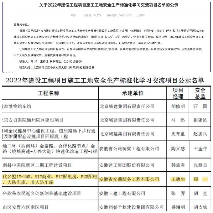 近日,從中國(guó)建筑業(yè)協(xié)會(huì)網(wǎng)站獲悉,由安徽交航公司承建的滁州時(shí)代名墅項(xiàng)目榮獲“2022年建設(shè)工程項(xiàng)目施工工地安全生產(chǎn)標(biāo)準(zhǔn)化”(原“國(guó)家AAA級(jí)”)榮譽(yù)稱(chēng)號(hào)。