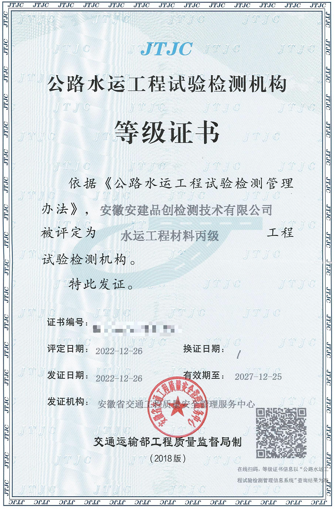 12月26日,品創(chuàng)檢測公司榮獲水運工程材料丙級資質(zhì),此次丙級資質(zhì)的取得標志著品創(chuàng)檢測公司“十四五”發(fā)展規(guī)劃邁上新臺階,同時也為進一步提升水運行業(yè)等級資質(zhì)以及開拓水運工程檢測領域奠定了堅實的基礎。