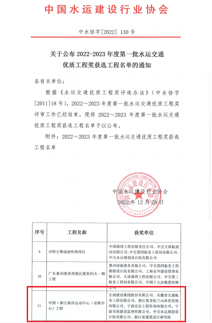 12月28日,由安徽交航和宏潤建設聯合體承建的中國·浙江海洋運動中心(亞帆中心)工程榮獲“全國水運交通優(yōu)質工程獎”,該獎項由中國水運建設行業(yè)協(xié)會頒布。