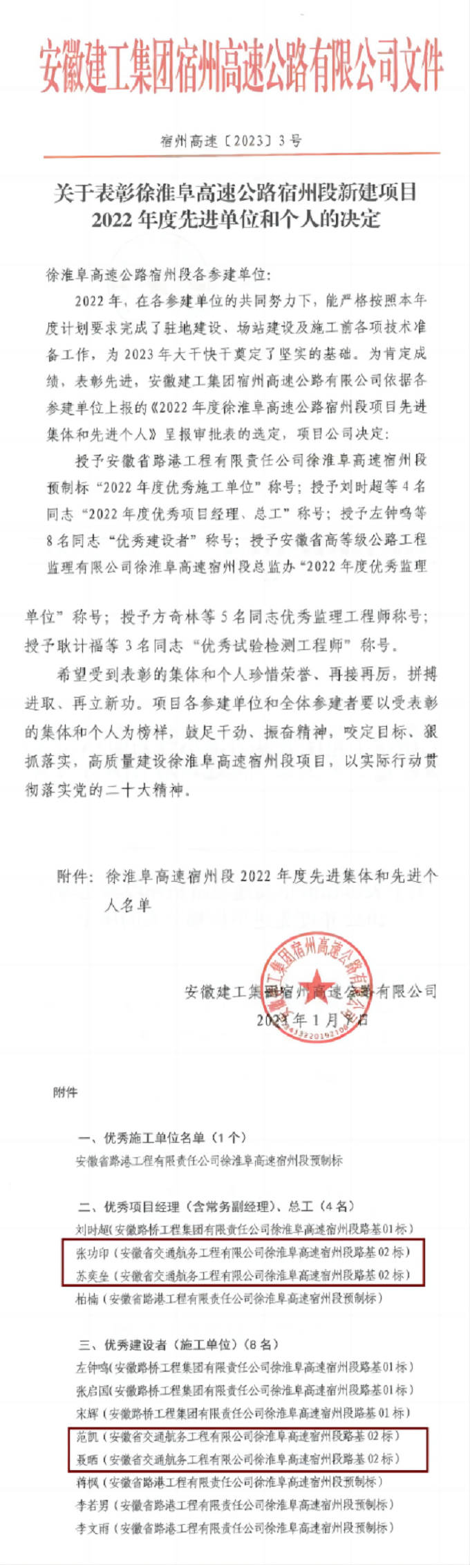 近日,安徽建工集團宿州高速公路有限公司對所參建各單位過去一年在推動徐淮阜高速公路宿州段建設(shè)中作出的貢獻予以集中表彰,安徽交航徐淮阜高速宿州段路基02標項目四人受到表彰,張功印、蘇奕壘獲“2022年度優(yōu)秀項目經(jīng)理、總工”稱號,范凱、聶曬獲“優(yōu)秀建設(shè)者”稱號。