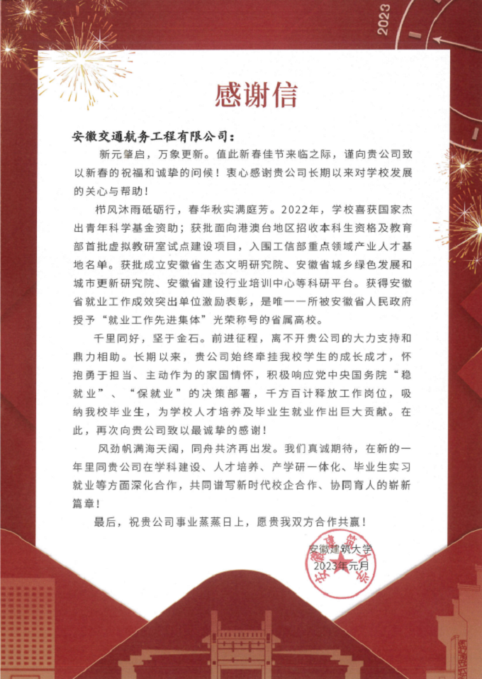 1月19日,安徽交航公司收到安徽建筑大學(xué)發(fā)來的感謝信。信中表示,安徽交航公司長期以來吸納安徽建筑大學(xué)畢業(yè)生,為學(xué)校人才培養(yǎng)及畢業(yè)生就業(yè)作出巨大貢獻(xiàn),特向我公司表示感謝。