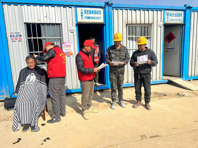 潭沖河家園項(xiàng)目發(fā)動青年志愿者們?yōu)轫?xiàng)目工人發(fā)放文明宣傳手冊,講解宣傳合肥市民公約(守則),同時團(tuán)支部組織志愿者服務(wù)活動,為工人提供義務(wù)理發(fā)。
