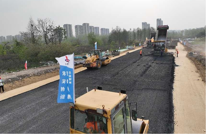 4月11日中午,青海路項(xiàng)目施工現(xiàn)場(chǎng)機(jī)械轟鳴、彩旗飄揚(yáng),項(xiàng)目道路水泥穩(wěn)定碎石試驗(yàn)段順利動(dòng)工,大型攤鋪機(jī)、壓路機(jī)、輸料車輛忙碌而有序地實(shí)施鋪設(shè)作業(yè),一條灰色的路面慢慢向前延伸。