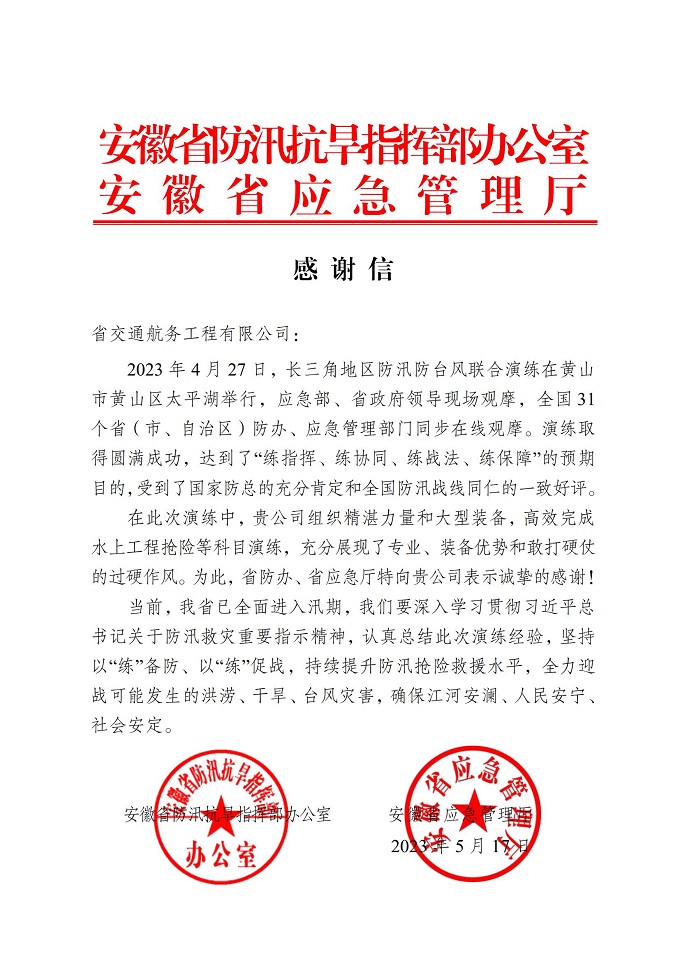 日前,公司收到安徽省應(yīng)急管理廳、安徽省防汛抗旱指揮部辦公室感謝信,對(duì)在長(zhǎng)三角地區(qū)防汛防臺(tái)風(fēng)聯(lián)合演練中,公司積極參與配合,組織精湛力量和大型裝備,高效完成水上工程搶險(xiǎn)等科目演練表示誠(chéng)摯感謝。