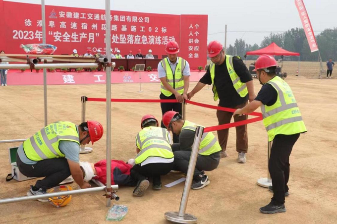 為檢驗(yàn)項(xiàng)目部應(yīng)對(duì)突發(fā)安全事故的應(yīng)急救援能力,提高應(yīng)急救援水平。6月16日上午,第三工程公司徐淮阜高速宿州段02標(biāo)項(xiàng)目部開展“人人講安全,個(gè)個(gè)會(huì)應(yīng)急”為主題的高處墜落事故應(yīng)急預(yù)案演練,進(jìn)一步提高項(xiàng)目部人員的安全防范意識(shí)和應(yīng)急處置能力。