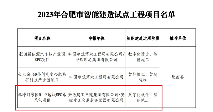 近日,合肥市智能建造試點(diǎn)城市建設(shè)領(lǐng)導(dǎo)小組辦公室公布2023年合肥市智能建造試點(diǎn)工程項(xiàng)目名單,建工交航承建的潭沖河家園D、E地塊EPC總承包項(xiàng)目位列其中,標(biāo)志著公司運(yùn)用智能建造技術(shù)在項(xiàng)目施工、生產(chǎn)、管理等全過程數(shù)字化應(yīng)用方面取得了階段性成果。
