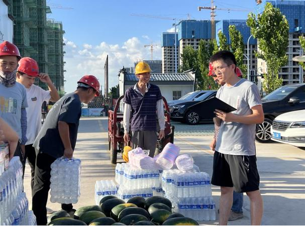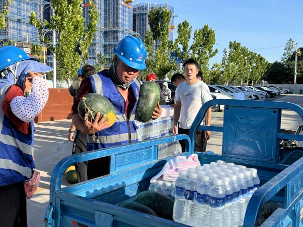 活動(dòng)現(xiàn)場(chǎng),項(xiàng)目部為現(xiàn)場(chǎng)一線工人代表送上了礦泉水、西瓜、藥品等防暑降溫物品,向他們表示親切問(wèn)候,感謝他們一直以來(lái)的辛苦付出,叮囑他們?cè)诟邷靥鞖庀乱⒁鈩谝萁Y(jié)合、做好防護(hù),確保自身健康和安全。