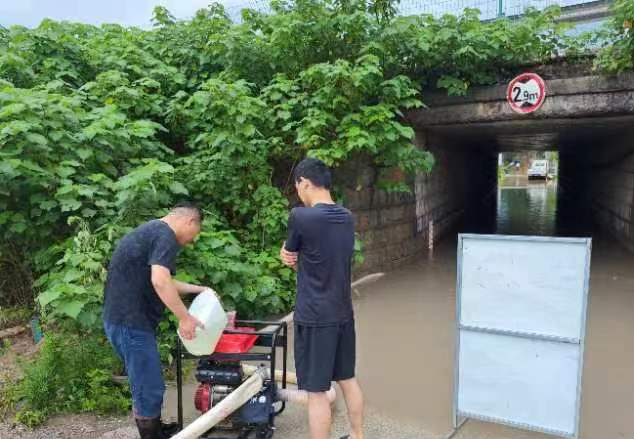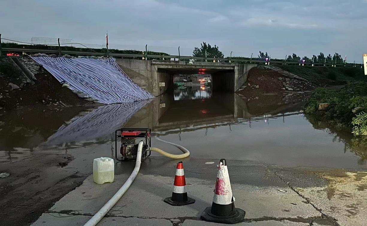 連霍高速下穿路段由于地勢較低,積水嚴(yán)重,已對過往車輛通行造成嚴(yán)重影響。面對這一緊急情況,項目部迅速響應(yīng),對遇險路段進(jìn)行封堵,組織人員安裝水泵,鋪設(shè)水管,爭分奪秒進(jìn)行排水工作,并安排專人進(jìn)行24小時值班,項目班子成員帶頭沖鋒,充分發(fā)揮“兩個模范”作用,為當(dāng)?shù)卮迕竦陌踩鲂斜q{護(hù)航。
