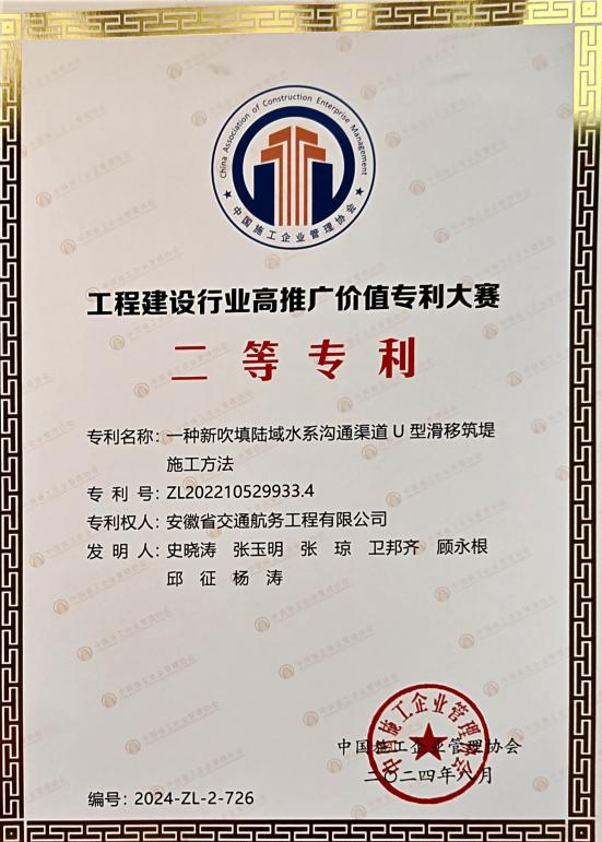 在工程建設行業(yè)高推廣價值專利大賽中,公司申報的“一種新吹填陸域水系溝通渠道U型滑移筑堤施工方法”發(fā)明專利榮獲二等獎。