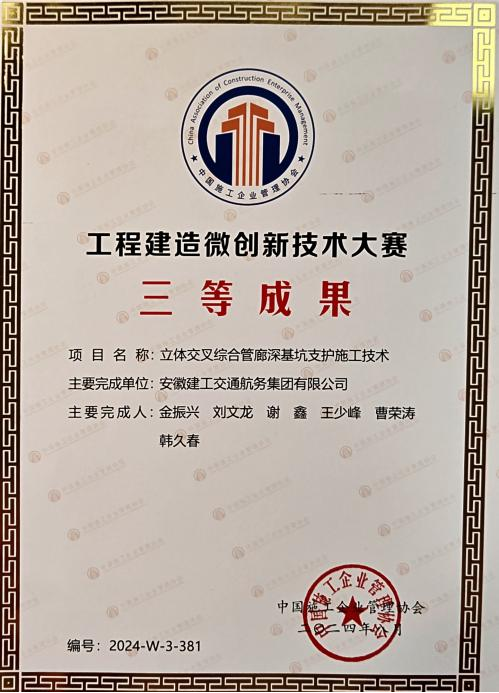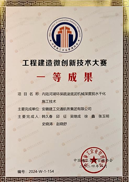 在工程建造微創(chuàng)新技術大賽中,公司申報的“內陸河湖環(huán)保疏浚底泥機械深度脫水干化施工技術”和“立體交叉綜合管廊深基坑支護施工技術”分別榮獲一等獎和三等獎。