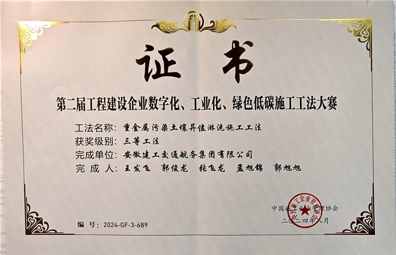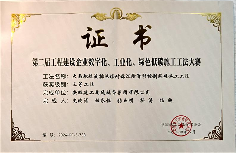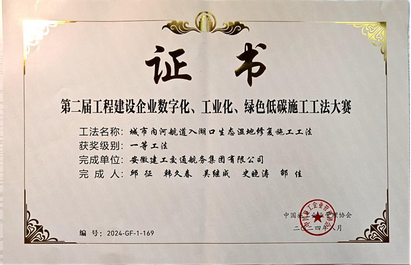 在工程建設企業(yè)“數字化、工業(yè)化、綠色低碳”施工工法大賽中,公司申報的“城市內河航道入湖口生態(tài)濕地修復施工工法”、“自浮裝配式土工管袋充灌操作平臺與隔污系統(tǒng)施工工法”、“重金屬污染土壤異位淋洗施工工法”、“大面積疏浚排泥場對稱沉降滑移控制筑堤施工工法”分別榮獲一等獎、二等獎、三等獎。